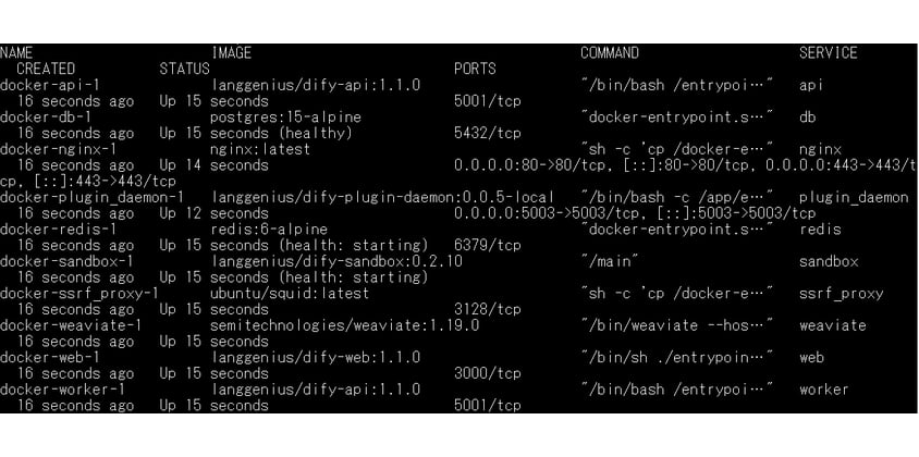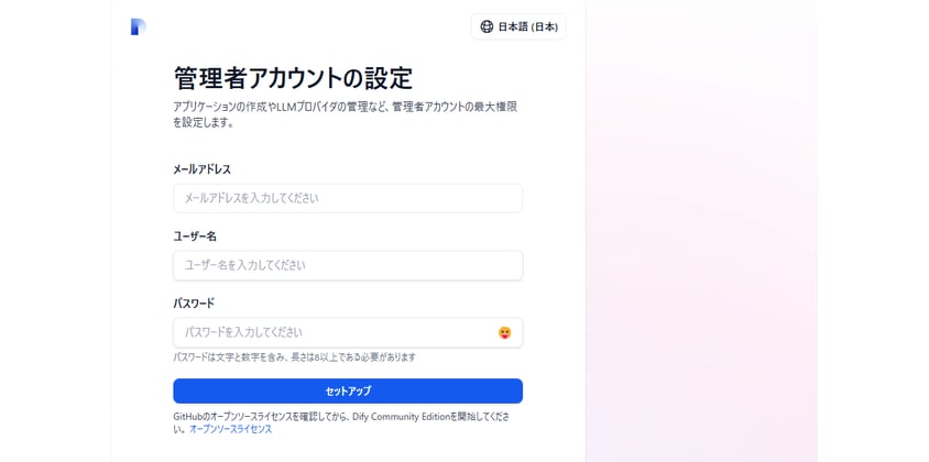 上記画像の様に表示されていればDifyが正常に起動しています。