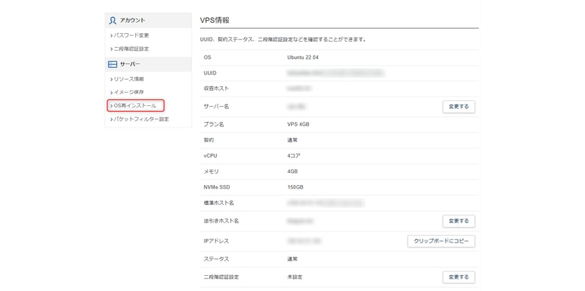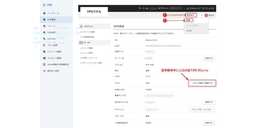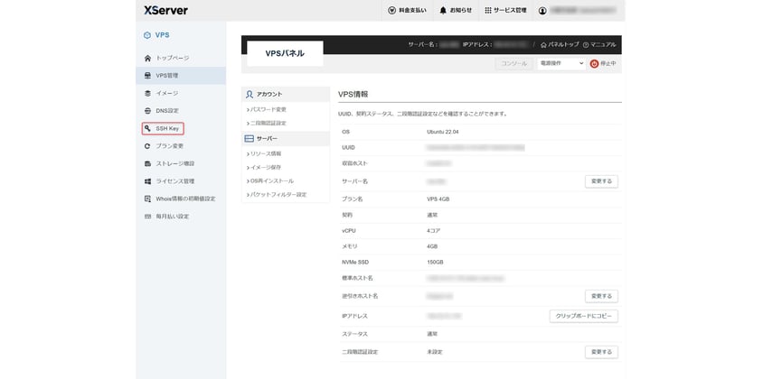 VPSパネルが表示されます。ここではパスワードの変更・二段階認証設定・リソース情報
