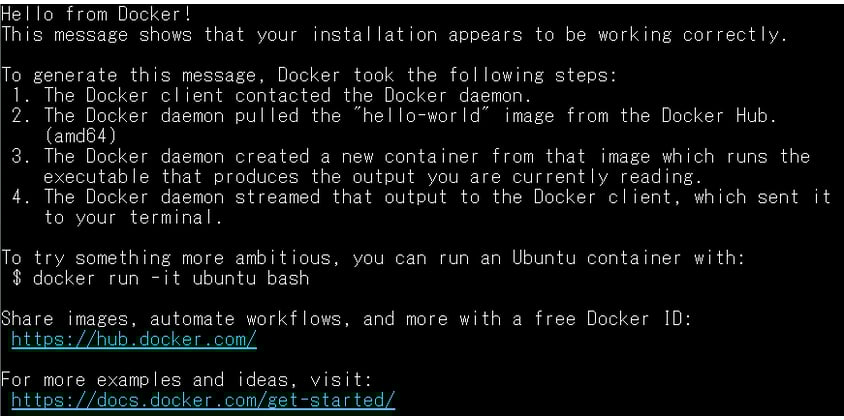 インストールが成功したか確認するため、以下のコマンドを実行してDockerのバージョン情報を表示します。