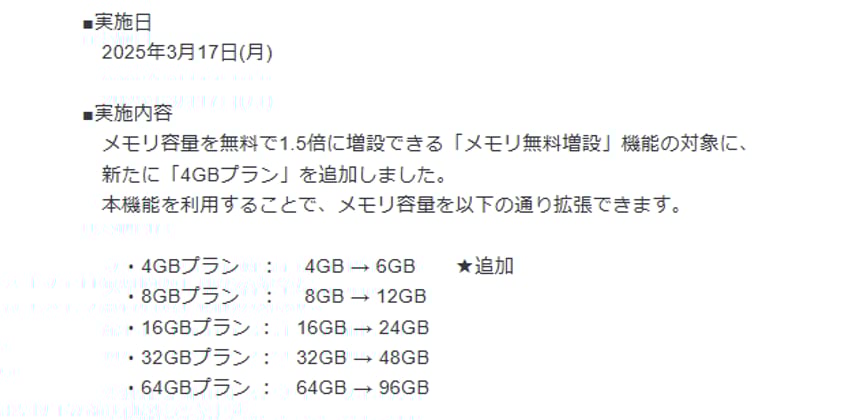 8GBプラン無料でしかも永続に増設 らしいです。メモリ12GBは、魅力的ですね