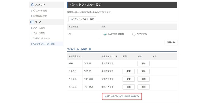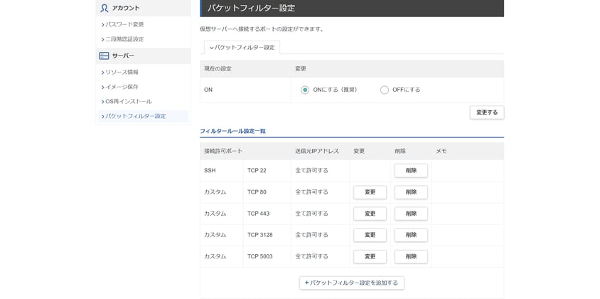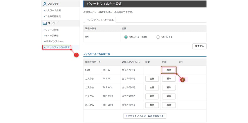 パケットフィルター設定を選んで SSH ポート欄の削除ボタンをクリックして削除してください。