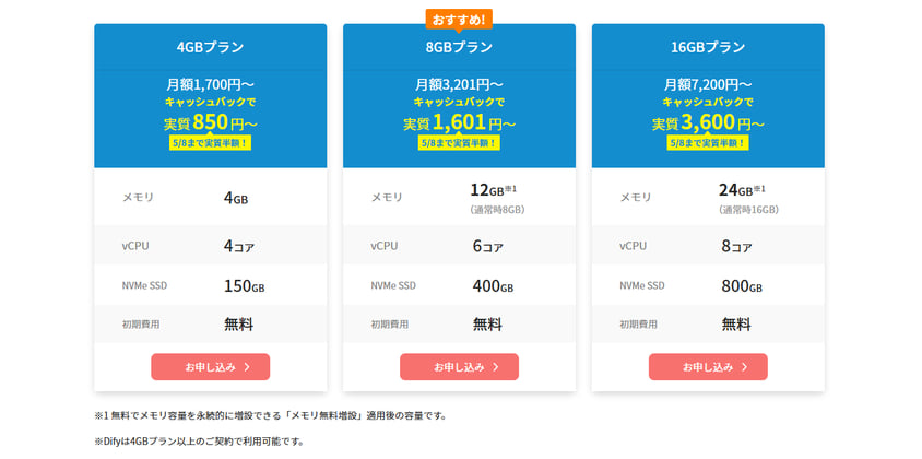 Difyが動く最低スペックが4GBプランです。それ以下無理です。狙い目は、おすすめの