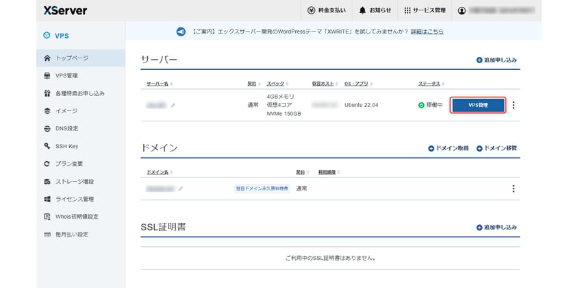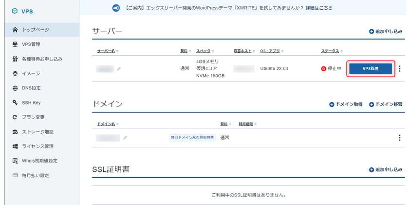 これがXserver VPS 画面になります。オラなんだかワクワクしてきたぞ