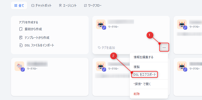 ① にマウスを持っていくとメニューが表示されます。 ②で DSLをエクスポートで